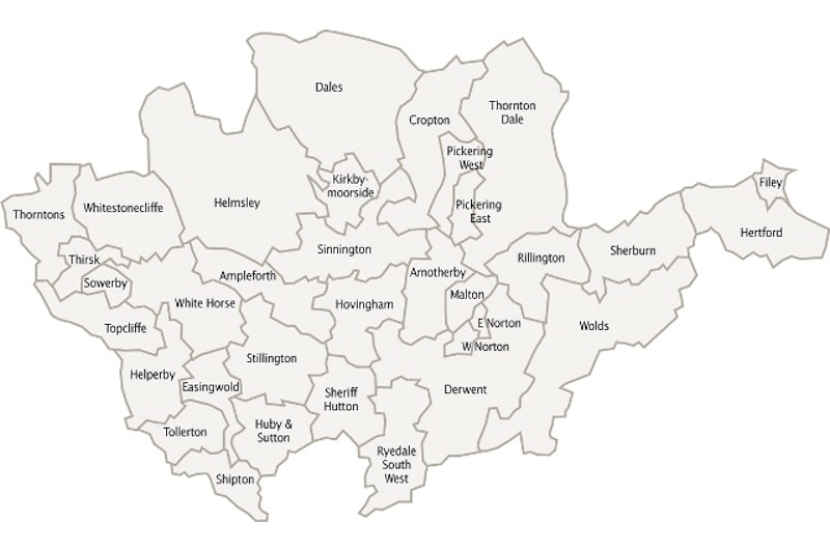 Hambleton District Council Bagby & Thorntons, Easingwold, Huby, Raskelf & Whitehorse, Sowerby & Topcliffe, Thirsk. Ryedale District Council Amotherby, Ampleforth, Cropton, Dales, Derwent, Helmsley, Hovingham, Kirkbymoorside, Malton, Norton East, Norton West, Pickering East, Pickering West, Rillington, Rillington, Ryedale South West, Sherburn, Sheriff Hutton, Sinnington, Thornton Dale and Wolds. Scarborough Borough Council Filey and Hertford