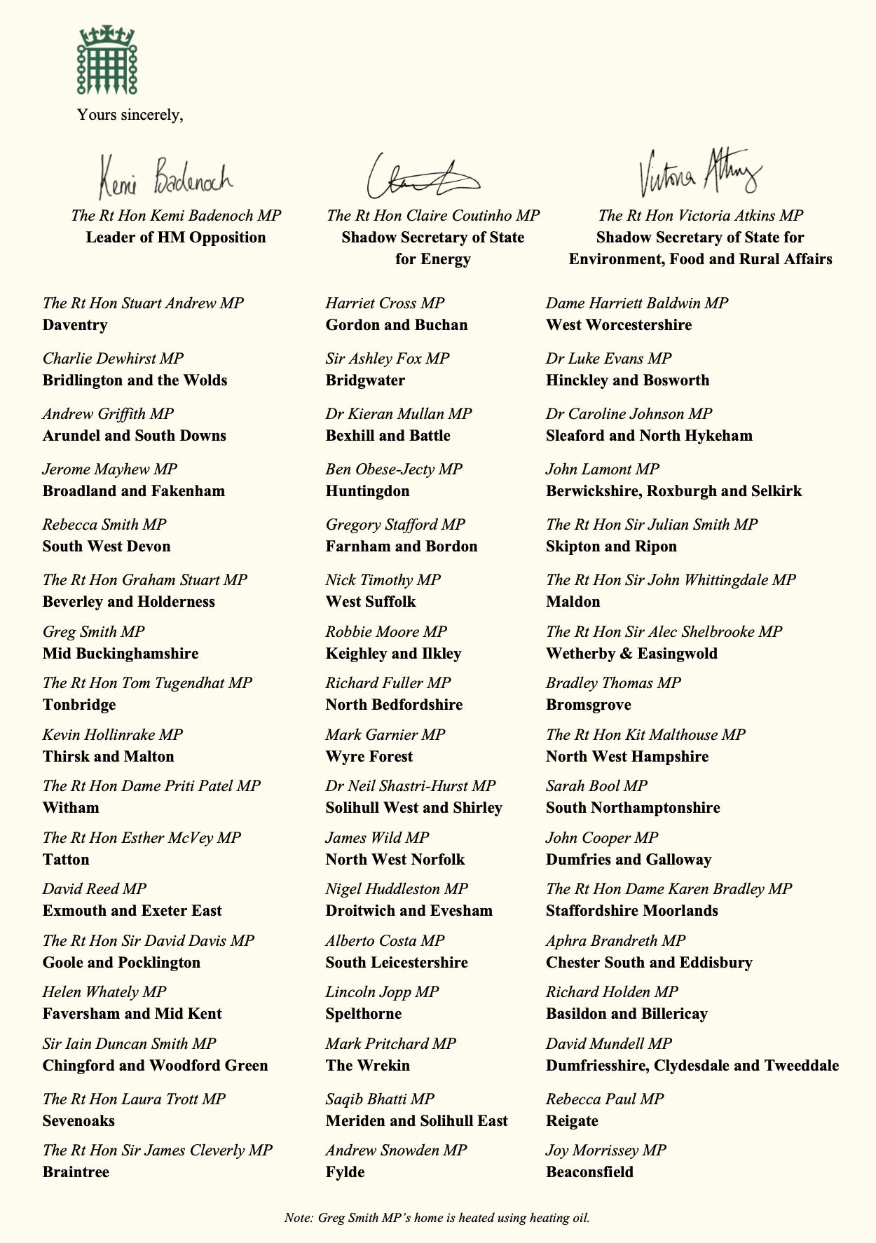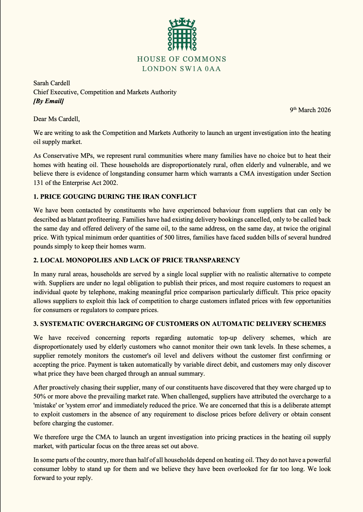 Alongside the Leader of the Opposition Kemi Badenoch, Shadow Energy Secretary Claire Coutinho and Shadow Environment Secretary Victoria Atkins, I have signed a joint letter to the Competition and Markets Authority (CMA) urging them to investigate pricing practices in the heating oil supply market.