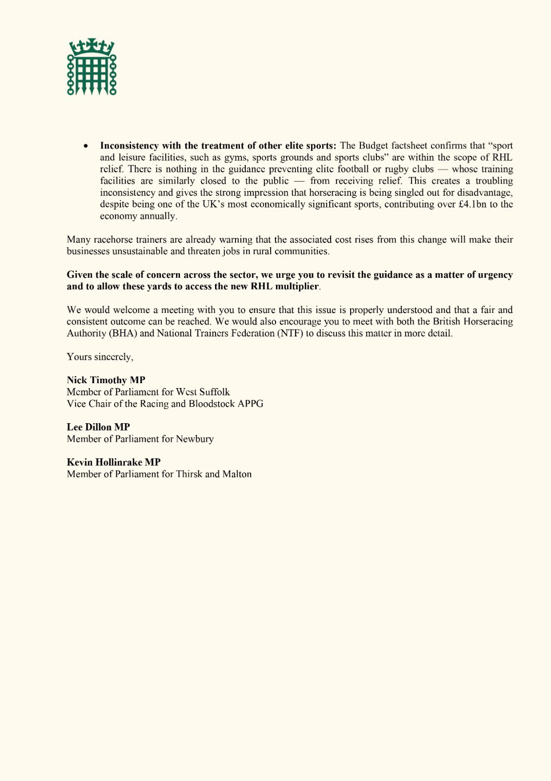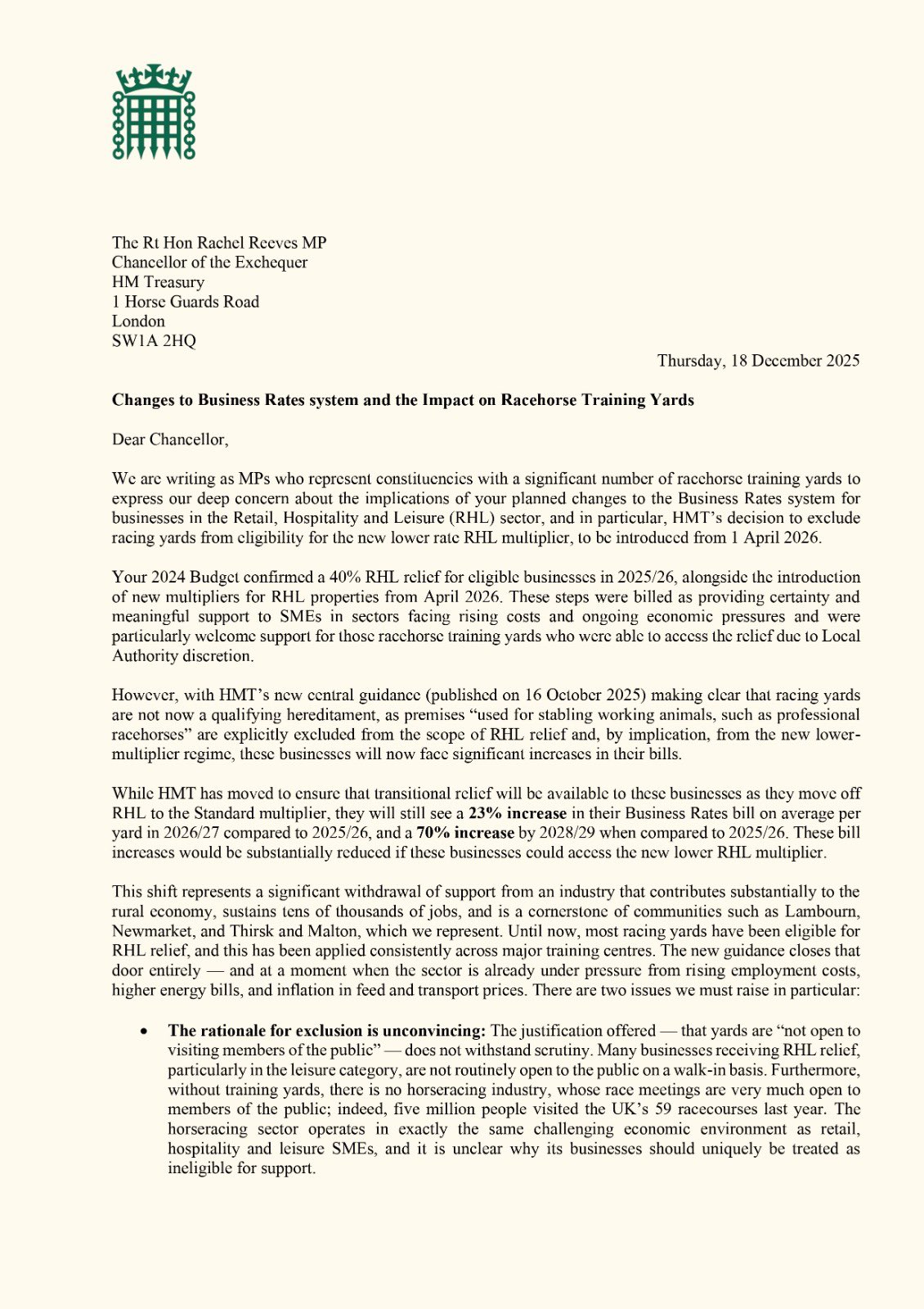 I am urging the Chancellor to urgently revisit this guidance, ensure fair and consistent treatment for racing yards, and engage properly with the industry to understand the real-world impact of these changes.