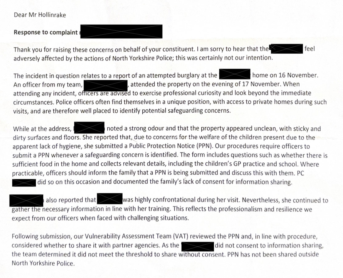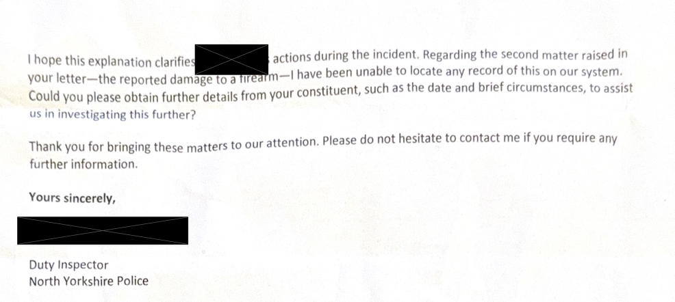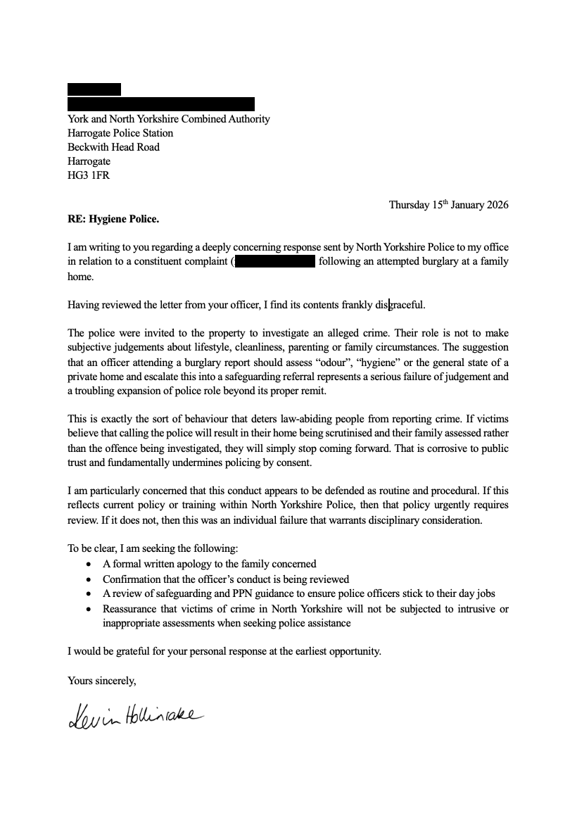 I have written to North Yorkshire Police to raise serious concerns about this incident, the justification provided and the broader implications for public confidence in policing. The correspondence relating to this case is attached.