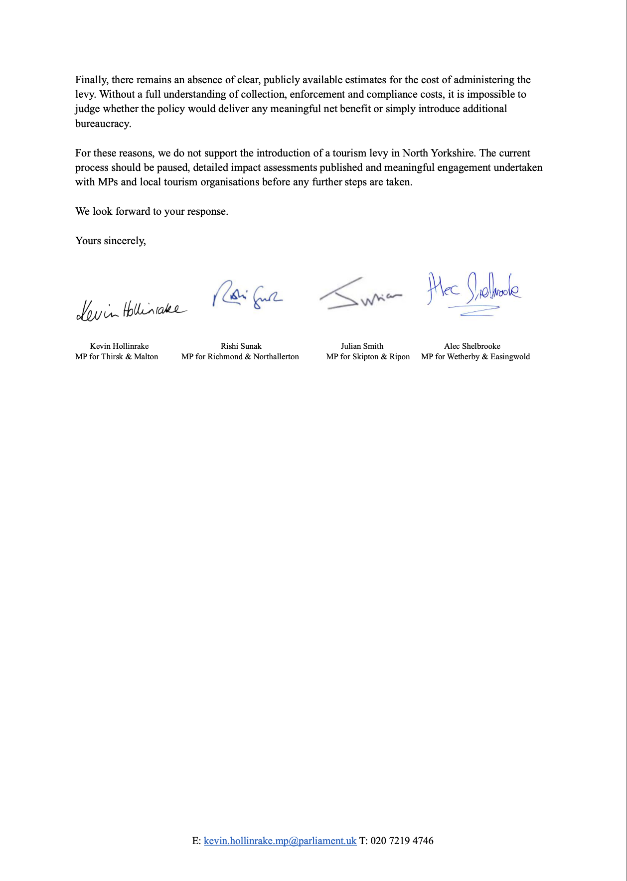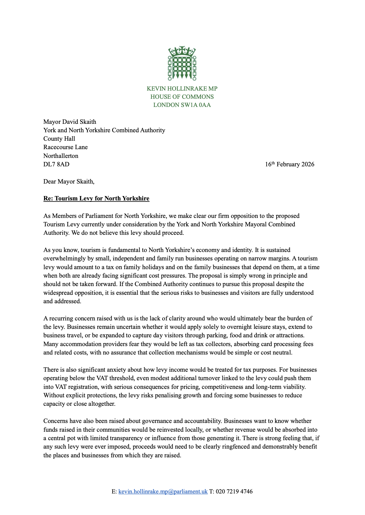 I have today written jointly to Mayor David Skaith to make clear my firm opposition to the proposed Tourism Levy currently under consideration by the York and North Yorkshire Mayoral Combined Authority.